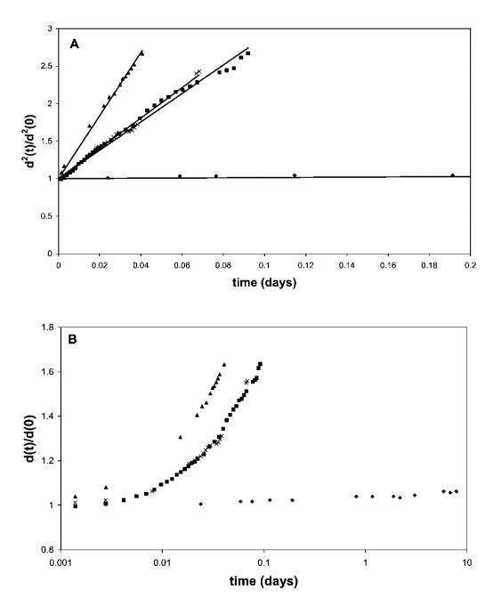 圖1面板A顯示了黃原膠溶液中50 vol%氣泡的相對(duì)平方氣泡直徑d2(t)/d2(0)。 泡沫由含有0.1 wt%HFBII(A)、0.5 wt%b-lg(-)、0.1 wt%b-酪蛋白(:)和0.1 wt%Quillaja皂甙(*)的水溶液生成。 將所得泡沫轉(zhuǎn)移到0.5 wt%黃原膠溶液中。 面板B以對(duì)數(shù)時(shí)間刻度顯示整個(gè)時(shí)間間隔內(nèi)的數(shù)據(jù)。