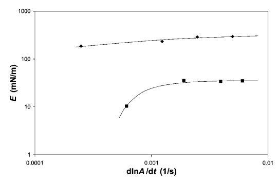 頻率依賴(lài)性。 為了評(píng)估其中一些系統(tǒng)中粘性損失的重要性,我們對(duì)b-lg和HFBII進(jìn)行了頻率相關(guān)的表面膨脹流變。 對(duì)于表面膨脹流變學(xué),我們顯示了在18<P<22 mN m-1之間測(cè)量的小變形模量(見(jiàn)圖10)。 注意,變形率d(lna)/dt為0.0012 s 1對(duì)應(yīng)于5 mm min 1的勢(shì)壘速度,用于大變形實(shí)驗(yàn)。 相比之下,歧化時(shí)間約為0.5小時(shí),接近泡沫實(shí)驗(yàn)觀察到的粗化時(shí)間。 HFBII的數(shù)據(jù)表明,在所研究的變形速率范圍內(nèi),變形速率對(duì)E的影響適中。 對(duì)于b-乳球蛋白,頻率的影響更為明顯,因此,在變形速率低于0.001 s 1時(shí),可觀察到E的強(qiáng)烈下降。 這表明b-lg的粘性損失比HFBII更為明顯。 這一比較再次表明,b-lg的外觀更柔軟,壓縮/膨脹時(shí)解吸/吸附能力更強(qiáng)。