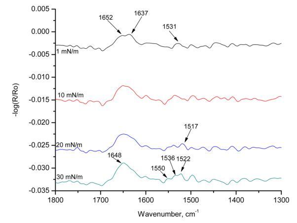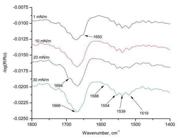 圖9顯示了在不同表面壓力下獲得的HI-Langmuir單層膜的s偏振輻照度。 在1 mN m的表面壓力下 ? 1,在1650 cm處存在一條帶 ? 1對應(yīng)于α-螺旋。 隨著表面壓力的增加,該條帶消失,并在1666 cm處并入該條帶 ? 1. 這條帶子長1666厘米 ? 1包括β-轉(zhuǎn)角和α-螺旋。 這條帶子有1694厘米長 ? 1對應(yīng)于β片。 這條帶子在1519厘米處 ? 1也對應(yīng)于α-螺旋。 在入射角為60°的情況下,在1670處觀察到的能帶可歸屬于存在于β-轉(zhuǎn)角中的空間約束C=O部分,或者由于β-薄片中的躍遷偶極耦合而注意到峰值中的分裂。 當改變表面壓力時,最強烈的譜帶出現(xiàn)在1554和1539厘米處 ? 1,兩條帶均對應(yīng)于酰胺II區(qū)的α-螺旋。 所有三條主譜帶都表明HI-Langmuir單層的s極化輻照度中存在α-螺旋。