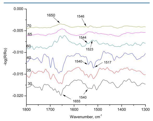 圖8顯示了HI-Langmuir單層在10 mN m處的p極化 ? 1在30、35、40、60、65和70°的六個不同角度。 在布儒斯特角之前,30、35和40 mN/m處的角未顯示出β片的特征帶。 所有三個角度顯示1655和1540厘米處的條紋 ? 1分別對應(yīng)于酰胺I和酰胺II吸收。 這條帶子在1517厘米處 ? 1,對應(yīng)于α-螺旋,在35°和40°中存在。 在布儒斯特角之后,所有60、65和70°的三個角都顯示出介于1650和1655之間的帶,這對應(yīng)于α-螺旋中的酰胺I吸收。 當角度為60°時,在1523 cm處可以看到峰值 ? 1,對應(yīng)于β片。 光譜中的其他譜帶都不是α-螺旋或β-片的特征。 光譜表明HI在空氣中以α-螺旋的形式存在 ? 水界面。 在10 mN m的恒定壓力下,隨著角度的增加 ? 1,發(fā)現(xiàn)光譜中的α-螺旋特征減少。