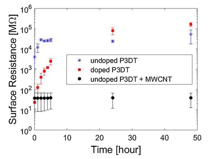 圖4。DOPEDP3DT、undopedP3DT和UNDOPEDMWCNT/P3DT單層電極的表面電阻隨時間的變化。