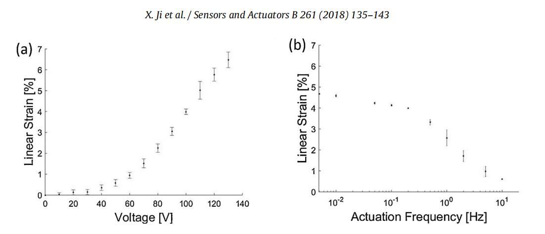 圖8。由1.4μm厚PDMS膜和單層電極組成的DEA的表征。(a)應變與電壓曲線,顯示100V時約4%的線性應變。(b)應變與驅動頻率曲線。