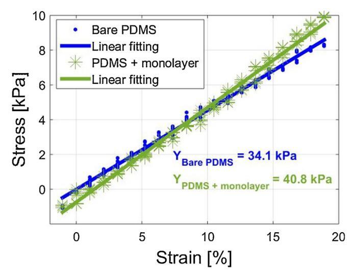 圖7。裸PDMS基板和覆蓋MWCNT/P3DT單層電極的相同PDMS基板的應力-應變曲線,允許測定單層剛度。