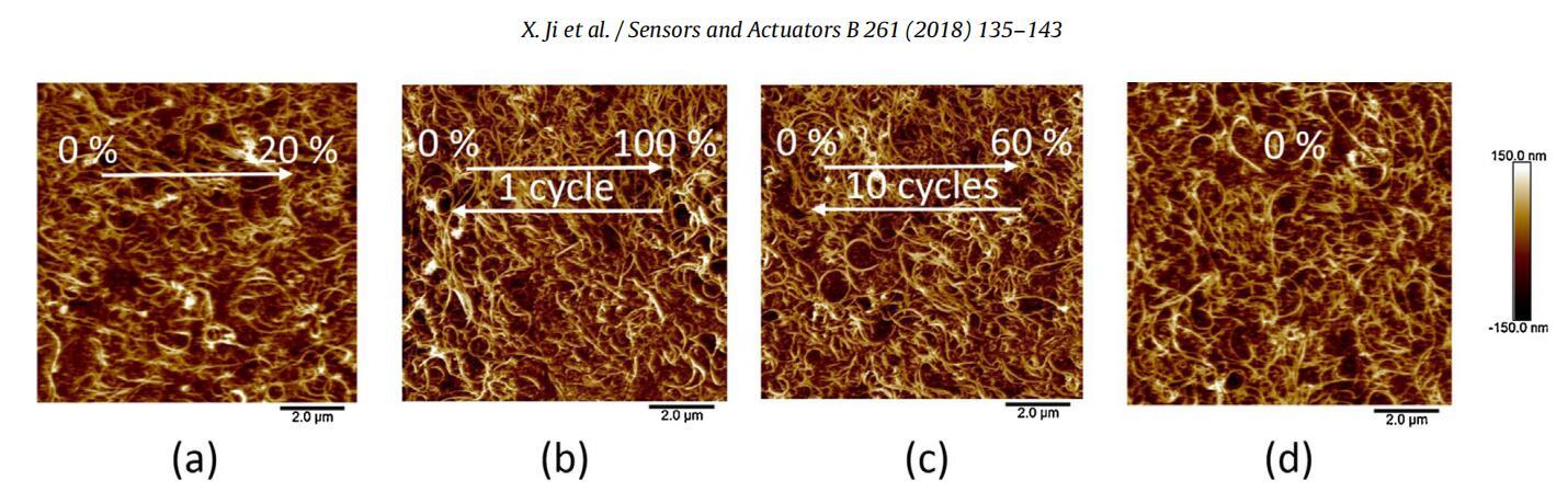 圖5。MWCNT/P3DT單層電極的AFM圖像。(a)在20%單軸應變下。(b)在100%單軸應變后恢復到0%應變。(c)在10個周期后,以60%單軸應變恢復到0%應變。(d)在0%單軸應變下,不施加任何應變。箭頭指示拉伸方向。