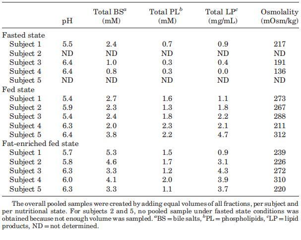 攝入Sure Plus1或Scandishake Mix1后前2小時(shí)的滲透壓通常高于禁食狀態(tài)下的HIF,盡管禁食狀態(tài)和兩種喂食狀態(tài)之間未達(dá)到顯著差異。禁食狀態(tài)滲透壓值一般為低滲透,或接近等滲透值。224 mOsm/kg的總體中值為低滲透性,與Brouwers等人1和Deferme等人報(bào)告的人類(lèi)十二指腸吸出物的平均滲透壓一致。,38但高于Perez de la Cruz Moreno等人報(bào)告的平均值。24在給藥(n?3)后,在混合樣品中獲得的滲透壓較低,與Kalantzi等人11和Gisolfi等人報(bào)告的滲透壓較好。39在喂食和富含脂肪的喂食狀態(tài)下均發(fā)現(xiàn)高滲值,尤其是在消化的前3小時(shí)。在喂食和富含脂肪的喂食狀態(tài)下,總的中位數(shù)滲透壓為等滲透壓(分別為285和278 mOsm/kg)。進(jìn)食后180分鐘內(nèi)較高的滲透壓與膽汁鹽濃度、磷脂或脂質(zhì)產(chǎn)物總量無(wú)關(guān)。Kalantzi等人19將吸入十二指腸內(nèi)容物的高滲值歸因于雙糖和果糖復(fù)合碳水化合物的存在,以及后者的緩慢吸收。在本研究中未確定總碳水化合物水平,因此,該陳述無(wú)法驗(yàn)證。