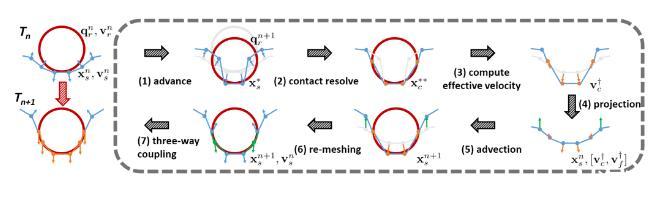 我們的耦合系統分為三個部分:流體,表面層,固體。流體部分我們采用傳統的歐拉網格的模擬方法,在交錯網格(Staggered Grid)上用算符分離的方法求解離散不可壓的Navier Stokes方程。固體部分采用傳統的拉格朗日方法求解牛頓方程。我們的主要貢獻在于在流體與固體之間插入了一層有質量、有厚度的流體表面層,這個表面層直接對應我們上面介紹的流體表面分子稀疏的部分。因為這個表面層非常薄,我們可以使用帶虛擬厚度的單層三角網格來表示,然后在這個表面層上施加表面張力勢能。為了將這三個部分耦合起來,我們在表面層和背景網格、固體和背景網格之間定義了速度的插值矩陣,同時將流體的壓強作用在表面層和固體上,以及將表面張力作用在固體上,這樣我們將這三部分寫進一個三相耦合方程里進行統一求解和更新。最終我們算法的流程如下: