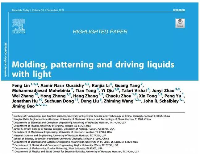 該論文以電子科技大學第一單位發表在國際頂級期刊Materials Today上,并被期刊主編選為Highlighted paper作為亮點工作報道,論文題為《光驅動液體塑模、繪畫和運動》(Molding,patterning and driving liquids with light)[1]。