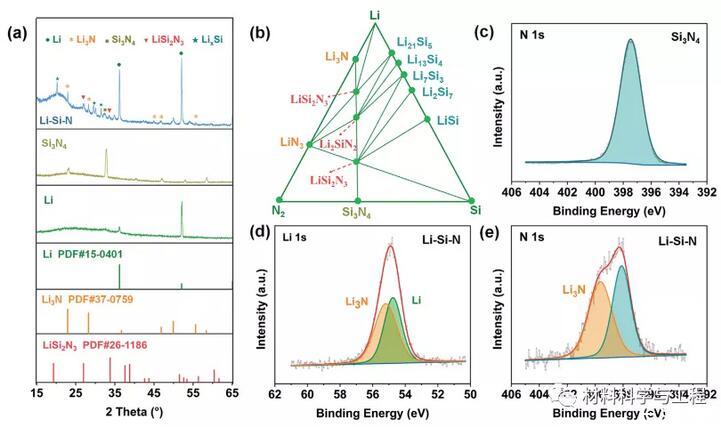 綜上所述,本文首次提出了用微量納米Si3N4(1wt%)調節熔融Li的表面張力來修飾Li|石榴石界面的實驗。從Li-Si-N系相圖出發,結合XRD和XPS分析,發現當加熱1wt%Si3N4和Li金屬的混合物時,Li3N、LiSi2N3和LixSi顆粒的形成是一致的,生成的復合材料稱為Li-Si-N熔體。Li-Si-N熔體通過兩種方式極大地改善了與石榴石的界面接觸: