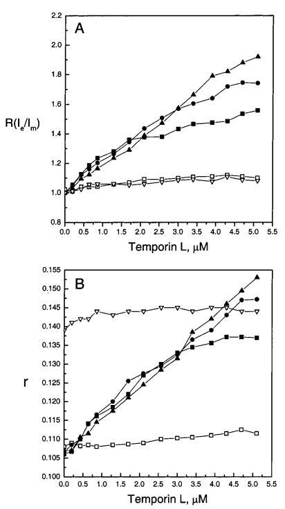 圖5:通過芘標(biāo)記的磷脂PPDPC(X)0.01)的熒光和DPH(X)0.002的穩(wěn)態(tài)發(fā)射各向異性r評估顳葉素L對LUV中脂質(zhì)動力學(xué)的影響,顯示為含XPOPG)0(0)、0.10(9)、0.20(B)和0.40(2)的SOPC脂質(zhì)體中歸一化準(zhǔn)分子與單體比率r(Ie/Im)(圖A)和各向異性r(圖B)的變化,Xchol)0.10(3)。每個數(shù)據(jù)點(diǎn)代表三次測量的平均值。標(biāo)準(zhǔn)偏差小于0.02(面板A)和0.004(面板B),為清楚起見,未顯示。否則情況如圖2圖例所示。