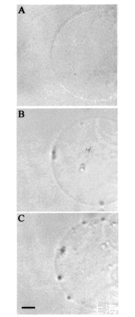 時間蛋白對膜拓?fù)浣Y(jié)構(gòu)的影響。巨大脂質(zhì)體是生物膜的優(yōu)秀模型,因?yàn)槠涑叽缗c細(xì)胞相當(dāng)。此外,它們可以通過光學(xué)顯微鏡進(jìn)行觀察(15,21)。我們之前對馬加寧2和吲哚肽的研究表明,這些肽對巨大脂質(zhì)體膜的拓?fù)浣Y(jié)構(gòu)有顯著影響(15)。在本研究中,在類似條件下,通過顯微鏡觀察了在巨大囊泡外表面添加這些肽后,temporins對巨大脂質(zhì)體三維拓?fù)浣Y(jié)構(gòu)的影響。SOPC巨脂質(zhì)體即使暴露于大量該肽(約1.2 fmol的temporin B)(每個重復(fù)100份12 amol)時,也不受temporin B的影響。同樣,含有膽固醇(Xchol)0.10)的巨大囊泡也不受該量的顳葉素B的影響。然而,在將該肽添加到SOPC和SOPC/膽固醇(Xchol)0.10)巨大脂質(zhì)體的表面時,偶爾會觀察到相鄰囊泡之間的粘附(數(shù)據(jù)未顯示)。然而,在POPG(XPOPG)0.10的存在下,已經(jīng)≈36 amol(10-18 M)的顳葉素B(約60 fL,3次注射)施加在巨大囊泡表面上,引起巨大囊泡膜拓?fù)浣Y(jié)構(gòu)的顯著變化(圖6,面板B)。具體來說,小顆粒(φ≈10μm),然后進(jìn)入巨大脂質(zhì)體的內(nèi)腔(圖6,面板B)。進(jìn)一步增加≈0.24 fmol的顳蛋白B(約400 fL,20次注射)導(dǎo)致巨大囊泡內(nèi)這些顆粒的數(shù)量增加(圖6,面板C)。還觀察到巨大囊泡表面的顆粒聚集(圖6,面板C)。隨后,在≈10分鐘后,將顆粒轉(zhuǎn)移到巨大脂質(zhì)體的內(nèi)腔中。