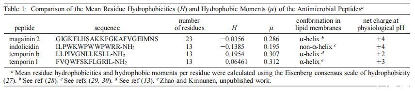 我們的長期目標(biāo)是建立最低的序列要求,這可以進(jìn)一步作為設(shè)計新型抗菌肽類似物的指導(dǎo)原則。我們之前已經(jīng)比較了兩種抗菌肽,馬蓋寧2和吲哚肽對本研究中使用的相同模型膜系統(tǒng)的影響,即。,單層、脂質(zhì)體和巨大囊泡(15)。我們早期研究中使用的肽是選擇的,因?yàn)樗鼈兇韮煞N不同類型的抗菌肽家族。在本研究中,我們使用了兩種13個氨基酸的肽,即與吲哚肽長度相似的肽。肽的結(jié)構(gòu)參數(shù)不同,如電荷、構(gòu)象、疏水性、疏水力矩和大小(表1)。有趣的是,在所研究的四種肽中,以摩爾為基礎(chǔ)計算的時間蛋白L最有效,作用于中性和酸性磷脂膜。與其他三種肽相比,其凈陽離子電荷和疏水性具有平均值(表1)。然而,在所示的肽中,temporin L具有最高的平均疏水力矩,這表明這可能是與其有效的膜擾動作用相關(guān)的一個重要參數(shù),這與之前比較magainin 2和其他抗菌肽的研究一致(31)。
