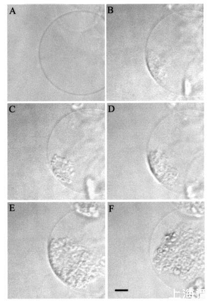 圖9:HMC圖像序列,說明了在添加肽之前(圖a)和應(yīng)用肽后立即通過temporin L.巨大囊泡轉(zhuǎn)化SOPC/膽固醇(Xchol)0.10)巨大脂質(zhì)體≈0.24 fmol的temporin L(面板B)。面板B中比例尺的長度對應(yīng)于50μm。