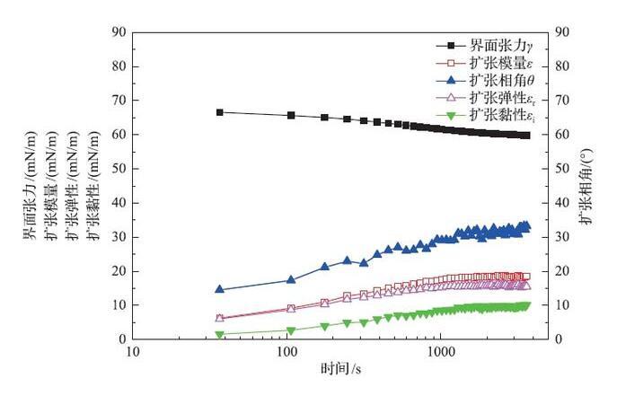 表面活性劑溶液的動態界面張力、擴張模量、擴張相角、擴張彈性和擴張黏性隨時間變化曲線
