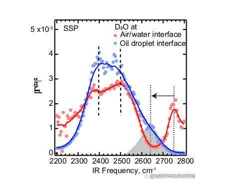 下圖顯示了分散的十二烷油滴(藍色圓圈)和空氣-水界面(紅色圓圈)的界面水(DO)光譜。(使用重水穩定了實驗條件,并將運行時間減少了約40%。)水分子的振動頻率偏移部分取決于與相鄰分子氫鍵的強度。2400 cm^-1和2500 cm^-1處的垂直虛線標記了氫鍵影響水的氧-氘鍵的頻率邊界。兩個接口的峰值頻率范圍大致相同。