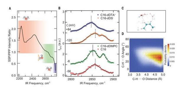 十六烷液滴在D2O中的SFS光譜中~100 cm?1的相當(dāng)大的頻率偏移(由灰色峰形突出)表明,電荷必須從水的O–D基團(tuán)轉(zhuǎn)移到油相的十六烷C-H基團(tuán)上,因為它們是接受電子密度的唯一候選基團(tuán)。如果存在如此強(qiáng)的相互作用,即可以預(yù)期油分子的振動模將經(jīng)歷向與高頻O-D模相反的方向移動。這種遷移應(yīng)伴隨著結(jié)構(gòu)的變化,如C–H???O H鍵的存在。為了研究這一點,記錄了界面C-H模的SFS譜,并進(jìn)行了MD模擬。界面C-H模的SFS譜圖顯示了CH 2(CH 2-ss)和CH 3(CH 3-ss)的對稱拉伸模在~2850和~2878 cm?1附近。十二烷-水界面顯示水和油分子相互作用讓人聯(lián)想到水和油之間的H鍵。作為C-H鍵的弱H鍵的受體,水分子上的O孤對提供了一些電子密度,使十二烷分子帶一個負(fù)電荷。
