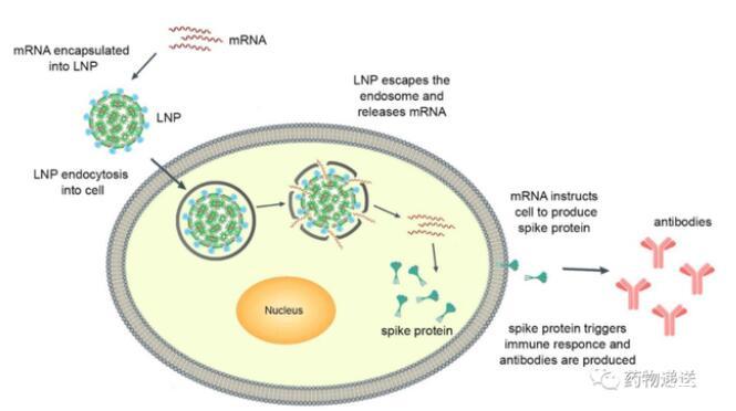 脂質(zhì)納米粒最新的成功案例是作為遞送載體用Pfizer/BioNTech和Moderna獲FDA批準的兩種COVID-19信使RNA(mRNA)新冠疫苗,這兩款疫苗以無與倫比的速度開發(fā)上市,并在流行病毒預(yù)防方面有著顯著的效果。疫苗將編碼SARS-CoV-2刺突蛋白的mRNA遞送到宿主細胞的細胞質(zhì)中,被翻譯成刺突蛋白充當抗原,對病毒產(chǎn)生免疫反應(yīng)。