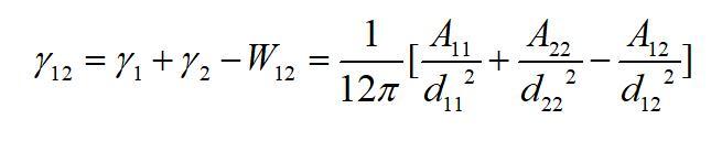 為物質(zhì)1的Hamaker常數(shù)。該作用勢能就相當(dāng)于本體的內(nèi)聚功。從表面自由能的定義不難看出,當(dāng)將本體沿本體內(nèi)的一個界面分開時,單位面積需要克服內(nèi)聚力所做的功就等于這個作用勢能。由于分開后形成兩個新表面,因此每個表面上的勢能等于該勢能的一半。因此物體的表面自由能(表面張力)也等于該作用勢能的一半,即