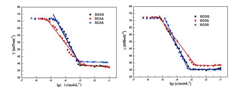 圖1 6種來自蓖麻油(左)和棉籽油(右)的酰基氨基酸表面活性劑在25°C下的表面張力曲線。畫線以顯示斷點(diǎn)。
