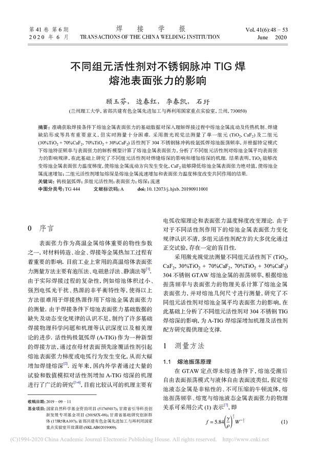 【摘要】:準(zhǔn)確獲取焊接條件下熔池金屬表面張力的基礎(chǔ)數(shù)據(jù)對深入理解焊接過程中熔池金屬流動(dòng)及傳熱機(jī)制、焊縫缺陷形成等具有重要意義,但實(shí)時(shí)測量十分困難。采用激光視覺法測量了單一組元(TiO_2,CaF_2)及二組元(30%TiO_2+70%CaF_2,70%TiO_2+30%CaF_2)活性劑下304不銹鋼脈沖鎢極氬弧焊熔池振蕩頻率,并根據(jù)特定模式下熔池特征頻率與表面張力的解析模型計(jì)算了熔池金屬表面張力,分析了不同組元活性劑對熔池金屬平均表面張力的影響規(guī)律,在此基礎(chǔ)上研究了不同組元活性劑對焊縫熔深的影響和增加熔深的機(jī)理。結(jié)果表明,TiO_2能夠改變?nèi)鄢亟饘俦砻鎻埩囟忍荻龋谷鄢亟饘倭鲃?dòng)方向發(fā)生變化,CaF_2能夠降低熔池金屬表面張力絕對值,使熔池金屬流速增加;二組元活性劑增加熔深是熔池金屬流速增加和表面張力溫度梯度改變共同作用的結(jié)果。