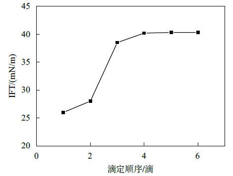 結(jié)果表明,液滴懸置5 min后,第一滴液滴表面張力值最小,隨著連續(xù)滴定的進(jìn)行,液滴表面張力值逐漸增大,最終趨于平衡。究其原因,可能是由于懸置一段時(shí)間后,表面活性劑分子在表面充分吸附,所以第一滴液滴表面張力最小,而隨著連續(xù)滴定進(jìn)行,由于平衡時(shí)間較短,表面活性劑分子在液滴的表面吸附未達(dá)平衡,所以數(shù)值逐漸增大,然而滴加液滴的速度一定,表面活性劑分子在表面的遷移速率一定,降低表面的能力與效率一定,最終會(huì)達(dá)到一個(gè)穩(wěn)定值。而平衡時(shí)間的長(zhǎng)短,與表面活性劑分子的性質(zhì)有關(guān),遷移吸附速率快的表面活性劑分子所需時(shí)間較短。由此可見(jiàn),使用懸滴法測(cè)定表面張力時(shí),時(shí)間效應(yīng)的影響不可忽略。