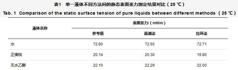 表1單一液體不同方法間的靜態(tài)表面張力測(cè)定結(jié)果對(duì)比(25℃)