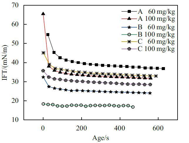 為了充分證明時(shí)間效應(yīng)對(duì)懸滴法測(cè)定結(jié)果會(huì)造成影響,實(shí)驗(yàn)使用懸滴法對(duì)A,B,C三種表面活性劑復(fù)配溶液較稀含量下的動(dòng)態(tài)表面張力進(jìn)行了研究。結(jié)果如圖3所示。