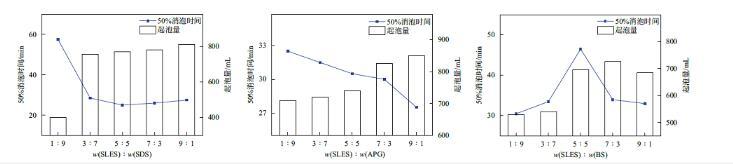 圖3復配組分對50%消泡時間和泡沫量的影響