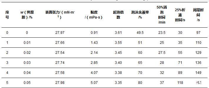 由表3可知,隨著黏度的增加,起泡倍數呈現下降趨勢,當黏度為0.91 mPa·s時,起泡倍數為3.61,當黏度為5.07 mPa·s時,起泡倍數為3.35。導致起泡倍數降低的原因可能與流動性和表面張力等因素有關,隨著溶液黏度的增加,溶液的流動性降低,表面活性劑向氣液界面遷移的能力減弱;由實驗結果可知,黃原膠的加入對表面張力無明顯影響,表明黃原膠屬于非表面活性物質,它的加入增加了液體的流阻但沒有增加液體流動的推動力(即降低表面張力),因此溶液的起泡能力下降。