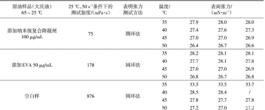 從表1可以看出,處理后添加納米級復合降凝劑100μg/mL大慶油樣、添加傳統(tǒng)EVA降凝劑50μg/mL大慶油樣、大慶空白油樣在25℃、50 s-1測試條件下的黏度是依次升高的,添加納米級復合降凝劑100μg/mL的大慶油樣品黏度最低,為75 mPa·s。相同的測試溫度條件下,黏度越大的油樣表面張力越大。其中,空白油表面張力最大,添加傳統(tǒng)EVA降凝劑的油樣次之,添加納米級復合降凝劑的油樣最小。原油油品的表面張力隨著溫度的降低而增大。