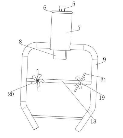 步驟三:在兩根出液管帶動加強(qiáng)桿轉(zhuǎn)動的同時將帶動渦輪葉片轉(zhuǎn)動,使轉(zhuǎn)動的渦輪葉片能夠通過轉(zhuǎn)軸帶動攪拌桿轉(zhuǎn)動,使攪拌桿對混料桶內(nèi)的試劑溶液進(jìn)行橫向攪拌混合,提高混合效果。